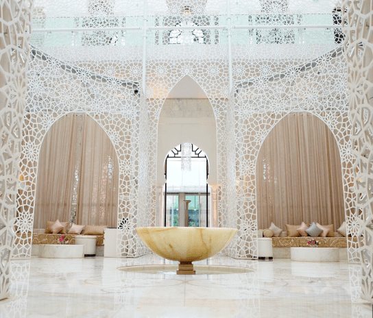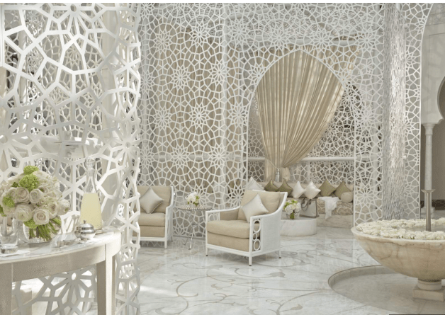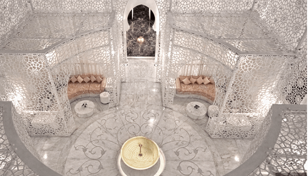 Les portes s’ouvrent sur une cathédrale de dentelle, blanche comme neige. Une gaze blanche immaculée. Un jet de lait marmorisé dans une sculpture en fer forgée blanc. On dirait une volière sans oiseau. De la pure poésie sous les latitudes orientales. Piques et pointes de lumière scintillent à la surface des alvéoles laiteuses, c’est un festin pour les yeux. On n’arrive plus à détacher son regard de cette apparition quasi céleste. Le regard se perd dans chaque alcôve, et le souffle coupé c’est à peine si on n’ose pénétrer sous cette merveille architecturale, pour s’installer dans l’une des alcôves nichées sous l’édifice. Une lumière pulpeuse jaillit du plafond, s’incurve, glisse et se perd dans les entrelacs ajourés de ce tissu de fer. C’est l’osmose entre la blancheur immaculée et la lumière du ciel d’Orient. Rien d’étonnant à ce que le Spa du Royal Mansour se voit décerner toutes les récompenses, c’est un lieu inoubliable où le regard ne sait plus où donner de la tête…