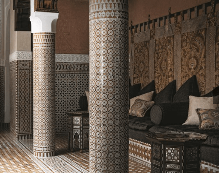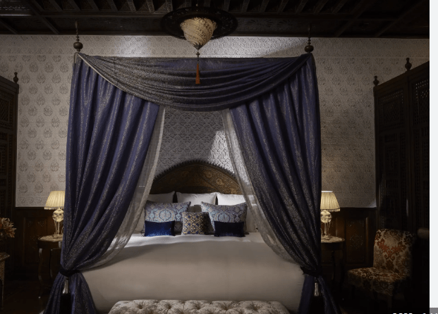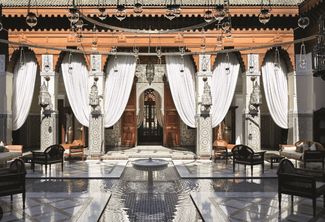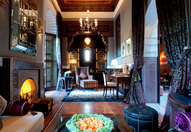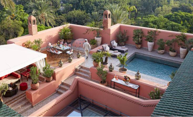 Dans ce palace aux allures de palais, on est reçu royalement. Un majordome ganté de blanc vous conduit dans votre demeure privée, l’un des cinquante-trois riads que compte l’hôtel. Chaque riad a sa piscine sur le toit, sa terrasse privée, son solarium, sa tente de relaxation, sa cuisine privée, son patio aux motifs traditionnels marocains, sa salle de séjour, ses chambres. Sur le lit à baldaquin, on barbote dans la soie, le velours, dans un luxe délicieux, entre étoffes aux tons mordorés, couleurs somptueuses, harmonies dorées et argentées, boisées et cuivrées. Sans parler des salles de bain toutes plus splendides les unes que les autres. L’atmosphère est raffinée, chaleureuse, propice au bien-être. On se sent comme chez soi. Mieux, à la maison.