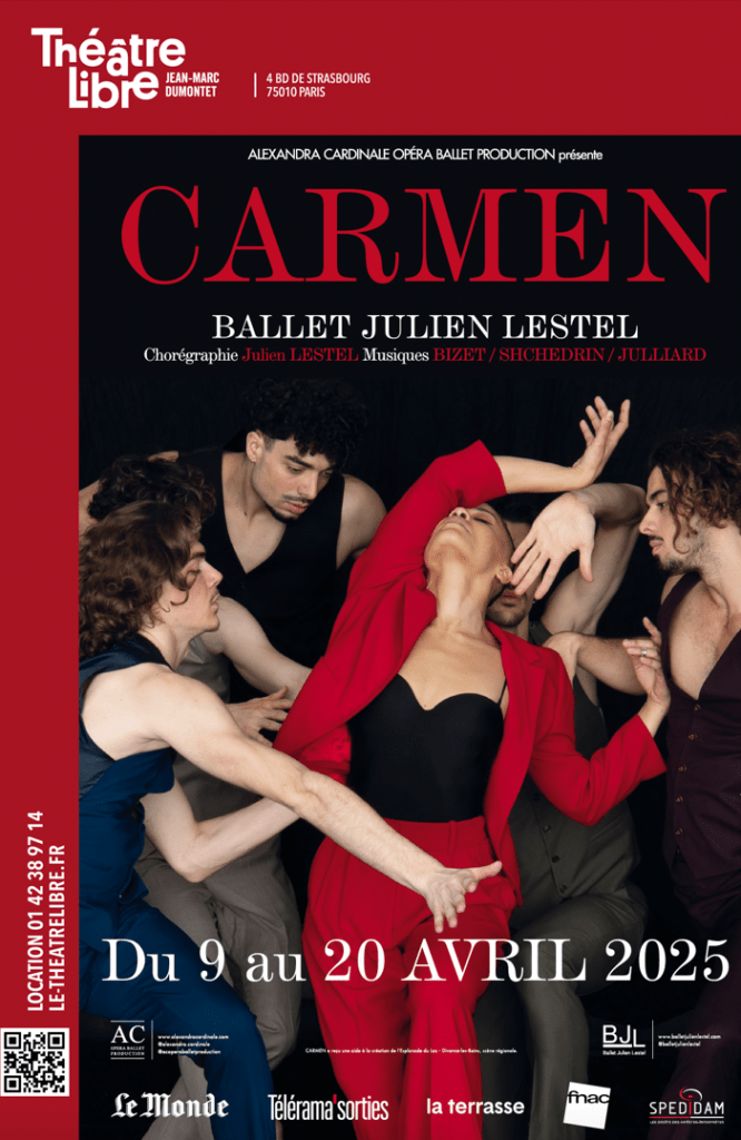 Mourir d’amour. Aimer à en mourir. L’amour et la mort sont-ils inséparables ? La passion (dont l’étymologie patior signifie souffrir, subir) mène-t-elle forcément à la mort ? Serait-ce Nietzsche qui a raison lorsqu’il dit que l’essence même de l’amour, c’est l’esprit tragique ? Si la passion est souvent fatale, c’est parce qu’elle ne connait aucune limite. Aucun frein, aucune morale, aucun tabou. Absolue, exclusive, excessive, elle ravage tout sur son passage. Elle sème la souffrance, comme elle sème le manque et la jalousie. Elle appelle le désir de meurtre ou de suicide. Lacan nous avait prévenu : « L’amour est un genre de suicide », quand il ne pousse pas à la volupté de l’irréparable. C’est le cri déchirant de Don José qui retentit à travers les siècles : « Oui, c’est moi qui l’ai tuée, ma Carmen adorée! » Et pourtant nous appelons de nos voeux cet amour funeste, le chérissant plus que tout. Pour sa capacité à transfigurer notre vie ? A sublimer notre mort ? Par quête d’un amour sans fin ? Un amour plus fort dans la mort que dans la vie ? Ou parce que ce qui nous tue nous rend étrangement plus vivant que jamais ? Dans sa toute dernière création, Carmen, produite par la passionnée et talentueuse Alexandra Cardinale, l’immense chorégraphe Julien Lestel nous entraîne dans une histoire d’amour et de sang. Et ça swing ! Préparez-vous à vivre un choc lumineux, une déflagration captivante, incroyablement bluffante, qui s’achève en un fabuleux crescendo. Ce ballet Carmen, c’est de la beauté à jet continu. Une merveille, une splendeur visuelle, inlassablement percutante, qui bat au rythme d’un coeur amoureux, où la passion côtoie la violence, où les non-dits se métamorphosent en musique. Avec ce ballet à couper le souffle, Julien Lestel se hisse à la hauteur des meilleurs et il pourrait bien en remontrer à ses grands prédécesseurs, Bizet et Mérimée ! Tout commence par un prénom. Prénom Carmen. Dans une sorte d’ivresse qui nous saisit dès l’apparition de la belle bohémienne, jusqu’à son dernier souffle, on se laisse envahir par la divine poésie de ses gestes. On boit à sa soif d’absolu, on s’enivre de ses désirs. Sur scène, les chairs s’épousent et se repoussent. Carmen s’éprend puis se déprend de Don José. Carmen se donne puis se refuse. Elle s’échappe puis revient. De reculades en escapades, de séduction en fuite, elle mène le jeu et la danse. Résultat : on oscille entre la légèreté et la violence, le transcendant et le trivial, la grâce et la trahison, le feu et la glace, le brûlant et le sanglant. Et c’est déchirant de beauté. Si « la liberté c’est de savoir danser avec ses chaînes » comme disait Nietzsche, alors Julien Lestel peut s’enorgueillir d’avoir donner des ailes à sa Carmen. Liane légère, ondine ondulante, de rouge carmin vêtue, Carmen (Mara Whittington) défie la pesanteur. Terriblement émouvante et expressive, la bohémienne moderne plane au-dessus des conventions, des traditions, des lois sociales. Elle nous initie à l’insoumission, à la rébellion, à la divine liberté, elle qui s’élève, s’élève, voltige d’homme en homme, tandis que l’on s’envole à ses côtés, dans une ascension aussi spirituelle que physique. Elle est libre, Carmen. Si libre qu’on voit son âme voler. Tandis qu’elle flirte irrésistiblement avec les cimes, Don José chute irrémédiablement. Son amour le tue, il souffre mille morts pour sa dulcinée. Il poursuit l’insaisissable, la fugitive, incapable d’arrêter sa course. Murmurant silencieusement à la manière d’Henri Calet: « Ne me secouez pas, je suis plein de larmes. » Ce supplice prend des accents si déchirants qu’ils vous fendent l’âme. Mais le passionné ne peut s’empêcher de chérir sa souffrance, car elle seule a le pouvoir d’exacerber sa passion. Plus il souffre, plus il aime. Ce que confirmait Dostoïevski : « La femme que j’ai le plus aimée est celle qui m’a fait le plus souffrir. » Le véritable tour de force de Julien Lestel, à rebours de Bizet et de Mérimée, est d’avoir choisi d’humaniser Carmen. Comme s’il avait compris mieux que personne, à quel point le désir peut être une dépendance. D’ailleurs, la sagesse antique ne cessait de clamer que nous n’avons aucune maîtrise sur ces deux puissances que sont le désir et le destin. Enjoignant leur contemporains à s’armer contre la passion et à refuser de se laisser guider par leurs désirs, (ces derniers ne connaissant pas ce qui est bien, ne recherchant que leur simple satisfaction, conduisaient immanquablement au malheur.) Prosper Mérimée avait écrit Carmen dans l’intention de mettre en garde ses lecteurs contre les ravages de la passion, qui réduisent notre vie à néant. Comme pour les Anciens, seule la raison devait gouverner la vie, la seule capable de nous apporter une vie heureuse. Or Carmen a fait de son bon plaisir, en quelque sorte, une servitude. Elle est l’esclave de ses désirs. Ce que Carmen appelle sa liberté, ne pourrait être finalement qu’une dépendance. En la rendant plus sentimentale, aimante et douce, Julien Lestel extirpe Carmen de ce piège aliénant du désir pour l’amener vers un amour plus tendre, confiant, et constructif. Exit la Carmen de toujours, cruelle et implacable, le Don Juan en jupon, bienvenue à l’amante contemporaine, affirmée et féministe qui entre dans une relation d’égalité avec Don José. Une affranchie capable de faire vaciller le désir de domination de Don José (Maxence Chippaux), en refusant la prison de sa jalousie. Malheureusement le destin a d’autres desseins pour Carmen, et c’est ce que montre magistralement Julien Lestel en les parant des traits attirants d’un beau toréador. Racé et raffiné, Escamillo (Titouan Bongini) est le personnage le plus sensuel du ballet. Doté d’une aura, d’un char