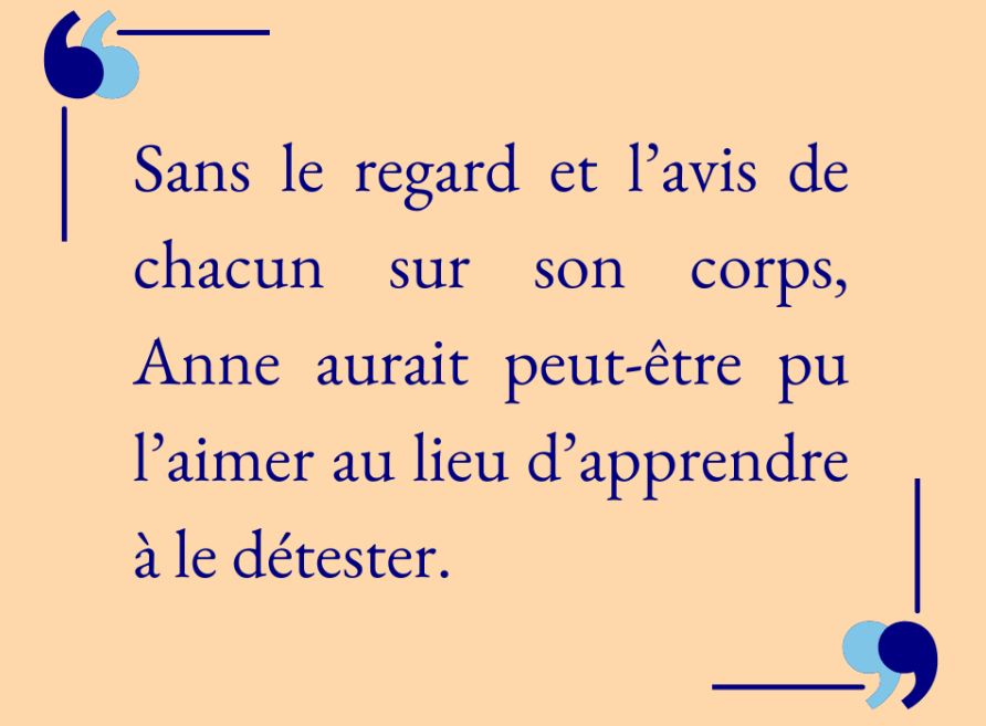Je ne vais pas commenter la citation de Bridget Jones, mais simplement répondre à la question concernant l’héroïne de mon roman, Anne. Malheureusement, il y a toute une vie de croyances et d’injonctions à déconstruire pour pouvoir trouver le plaisir sans la culpabilité. Donc, oui, elle a fait un long travail sur elle-même et elle ne l’a pas fait seule. Elle a trouvé les bonnes personnes pour l’entourer. Des personnes qui ne cherchaient pas à contrôler son poids.