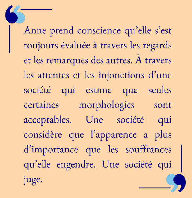 C’est plutôt le contraire. C’est parce que c’est un sujet auquel je me suis beaucoup intéressée que j’ai écrit ce roman. Parce que je me suis dit qu’il pouvait parler à d’autres femmes (notamment). Mais, surtout, parce que je trouvais qu’il manquait des héroïnes comme Anne dans les romans (et ailleurs). Ces femmes ont rarement droit au rôle principal. Quand c’est le cas, nombreux sont les clichés. Voire les caricatures. Souvent, d’ailleurs, ces héroïnes ne trouvent le bonheur qu’une fois qu’elles ont « enfin réussi » à perdre du poids. Je voulais faire entendre une autre voix, le bonheur n’est pas forcément dans la minceur. Et, surtout, j’espère avoir évité et même, si possible, détruit les clichés.