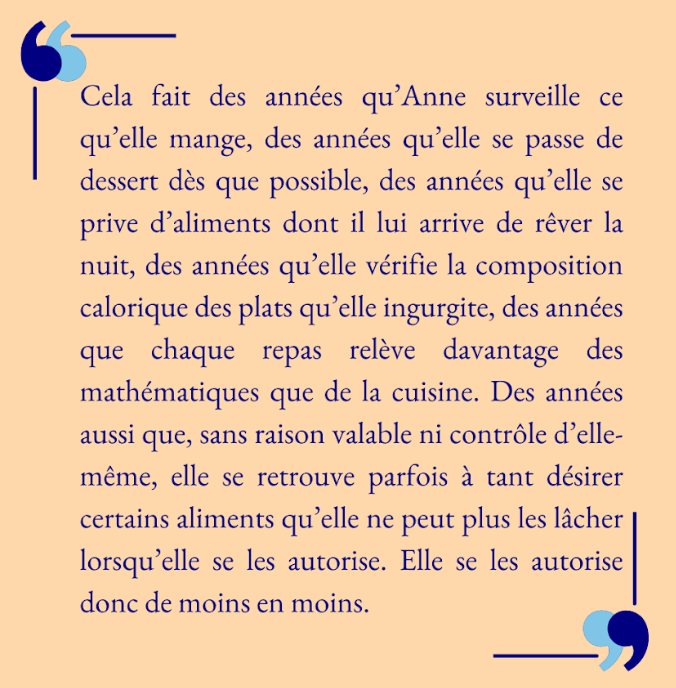 Effectivement, on trouve dans ce roman quelques situations où l’héroïne mange, sans presque s’en rendre compte, en proie à des émotions désagréables, dans l’espoir de les faire taire. Mais, au-delà de ces scènes isolées, il y a des années d’injonctions, de convictions, de privations.